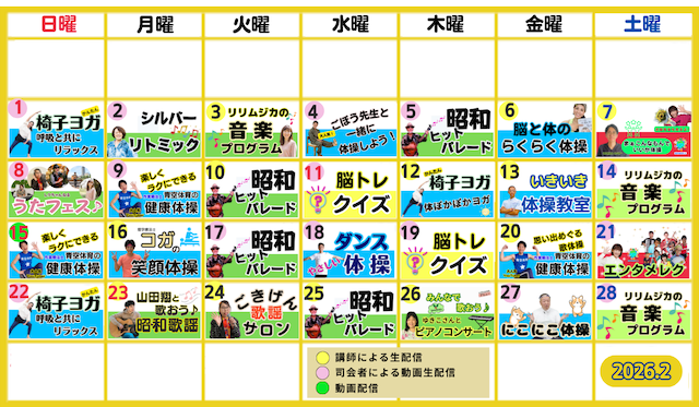 住所地球えんがお届けするエンターテインメントレクリエーション歌あり、笑いあり、ダンスあり、クイズありのバラティーに富んだプログラム。司会は介護福祉士で漫談家、介護福祉漫談家メイミさん。演芸コーナーはカンカラ三線・演歌師の岡大介さん。